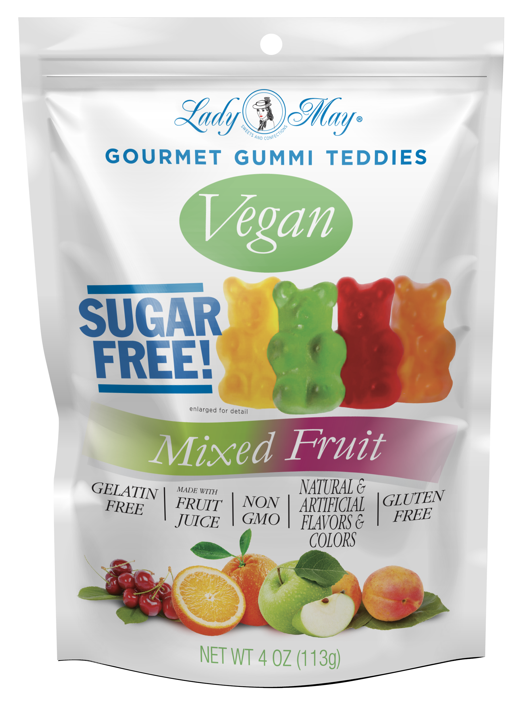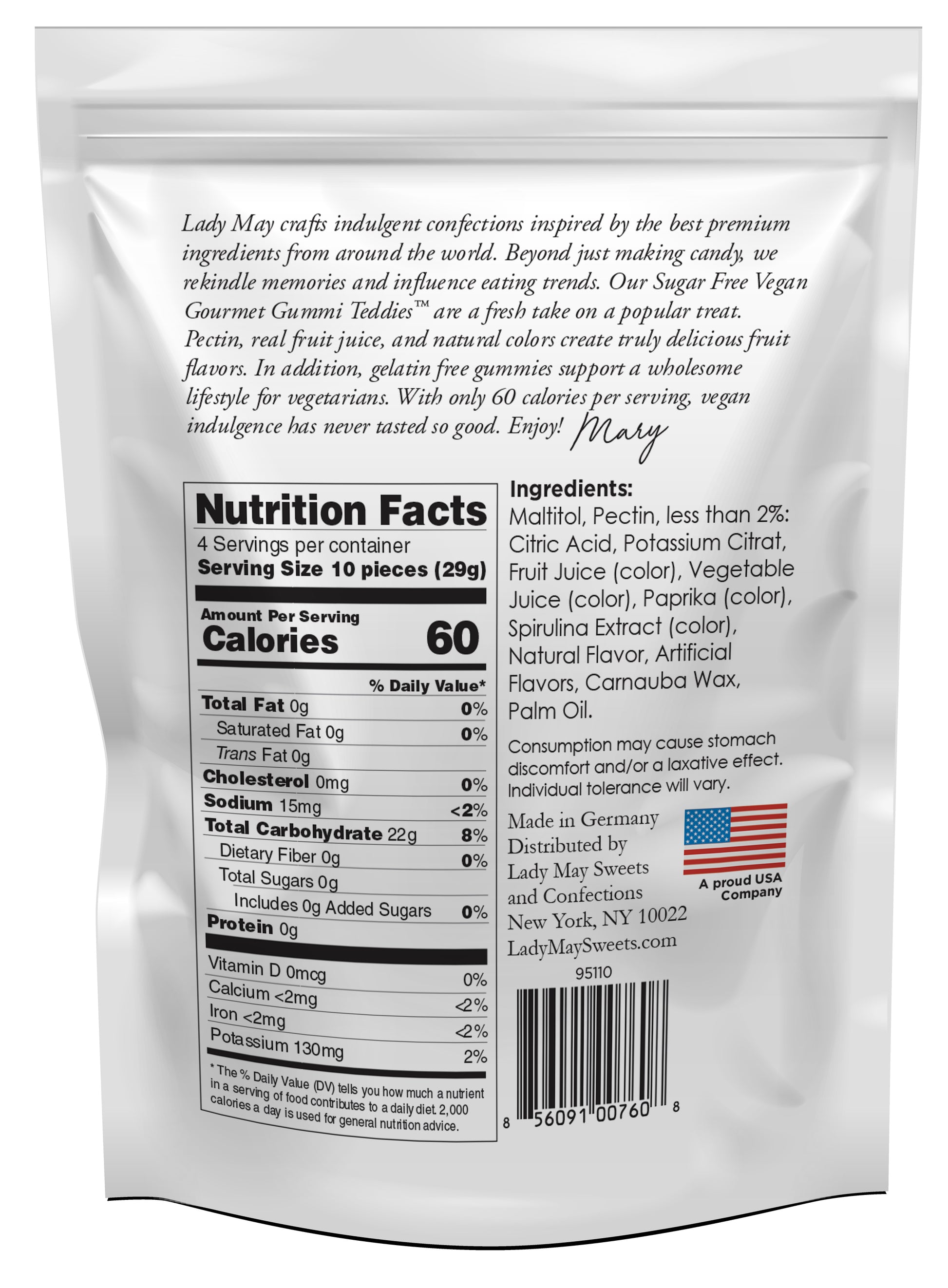 Pure, simple, all natural organic, vegan and sugar free ingredients in a flavorful gummi teddie. Our sugar free Gourmet Gummi Teddies are a fresh take on a popular treat. Pectin, real fruit juice and natural colors create truly delicious fruit flavors. In addition, gelatin free gummies support a wholesome lifestyle for vegetarians. Our vegan, sugar-free gummy bears are infused with all natural flavors of cherries, orange, apple and peach. With only 60 calories per serving, vegan indulgence has never tasted so good.