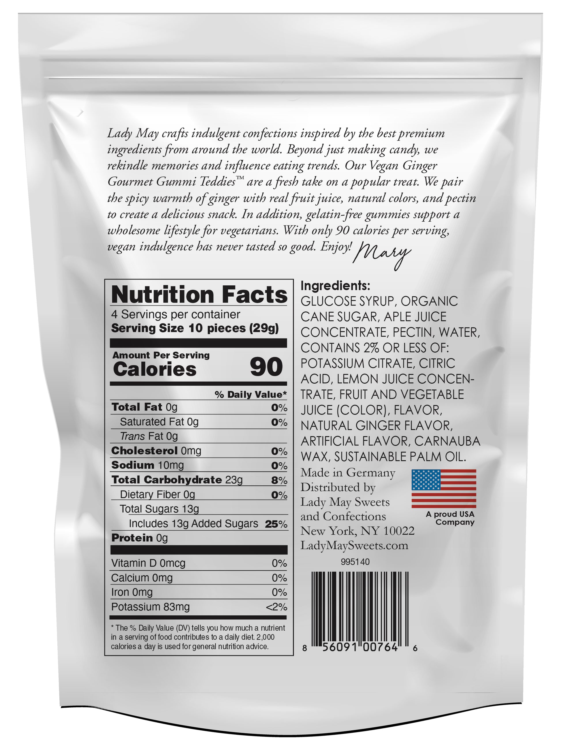 Pure, simple, all natural organic, vegan ingredients in a flavorful gummi teddies. Lady May crafts indulgent confections inspired by the best premium ingredients from around the world. Our Vegan Ginger Gourmet Gummi Teddies are a fresh take on a popular treat. We pair the spicy warmth of ginger with real fruit juice, natural colors and pectin to create a delicious snack treat. In addition, our gelatin-free gummies support a wholesome lifestyle for vegetarians. With only 90 calories per serving, vegan indulgence has never tasted so good.