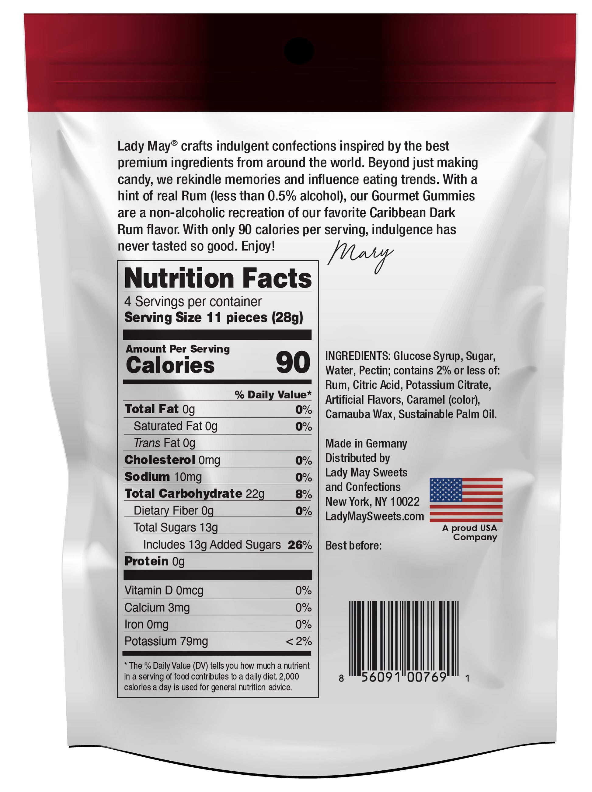 A Taste of Tropical Dark Rum Without the Alcohol! Lady May crafts indulgent confections inspired by the best premium ingredients from around the world. Our Vegan Ginger Gourmet Gummi Teddies are a fresh take on a popular treat. With a hint of real Dark Rum (less than 0.5% alcohol), our Gourmet Gummies are a non-alcoholic recreation of our favorite Caribbean Dark Rum flavor. In addition, our gelatin-free gummies support a wholesome lifestyle for vegetarians. With only 90 calories per serving, vegan indulgence has never tasted so good.
