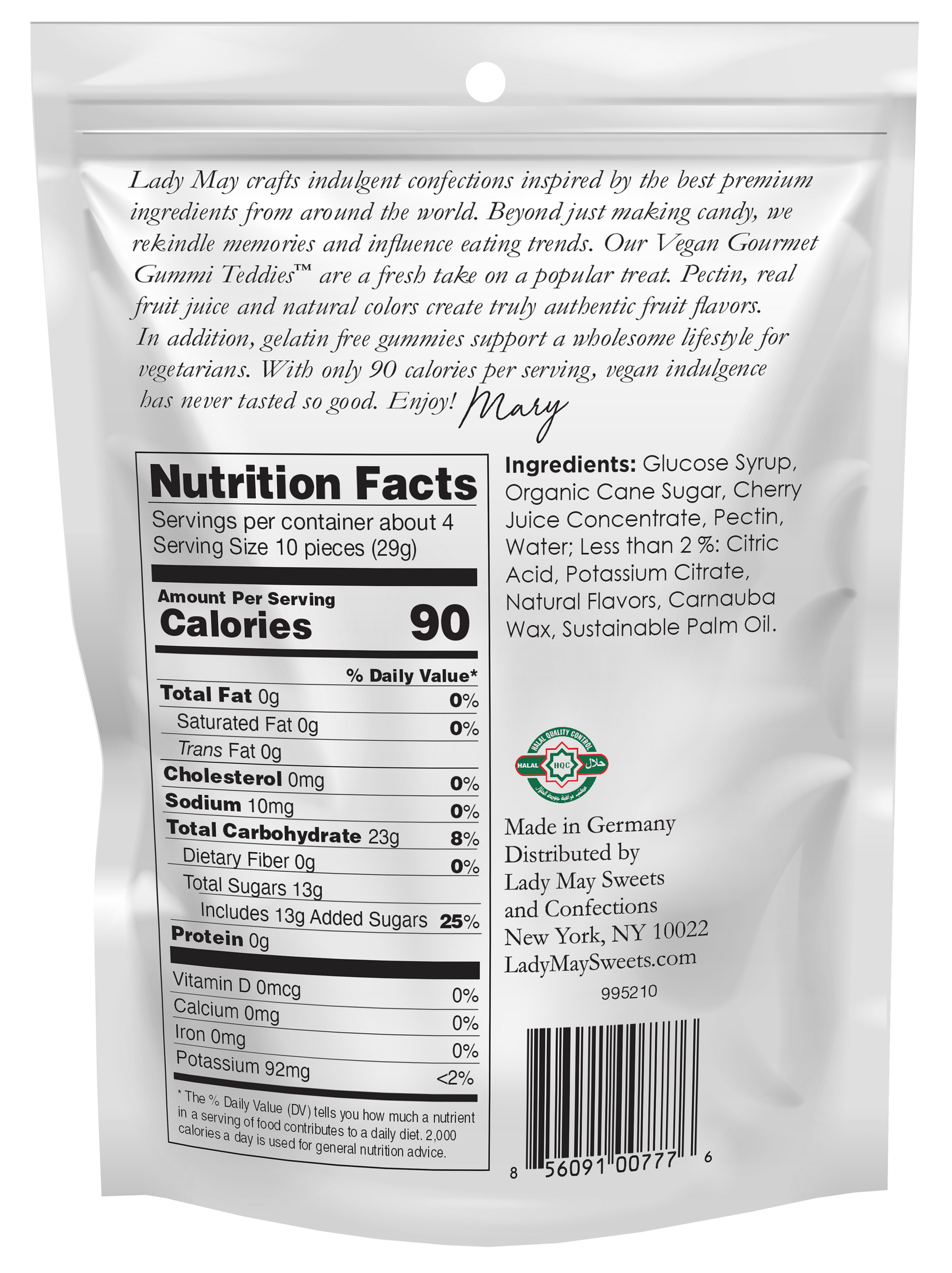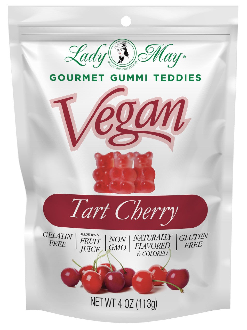 Pure, simple, all natural organic, vegan ingredients in a flavorful gummi teddie. Our vegan Gourmet Gummi Teddies are a fresh take on a popular treat. Pectin, real fruit juice and natural colors create truly authentic fruit flavors. In addition, gelatin free gummies support a wholesome lifestyle for vegetarians. Our vegan gummy bears are infused with all-natural flavor of real cherry juice. With only 90 calories per serving, vegan indulgence has never tasted so good!
