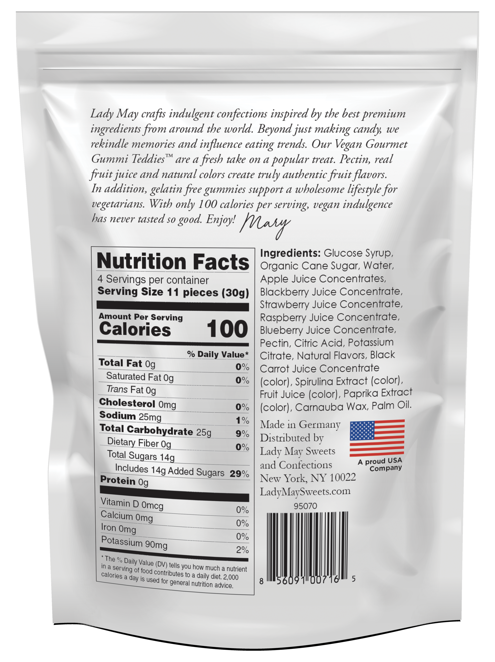 Pure, simple, all natural organic, vegan ingredients in a flavorful gummi teddie. Our vegan Gourmet Gummi Teddies are a fresh take on a popular treat. Pectin, real fruit juice and natural colors create truly authentic fruit flavors. In addition, gelatin free gummies support a wholesome lifestyle for vegetarians. Our vegan gummy bears are infused with all natural flavors of apple, blackberry, strawberry, raspberry, blueberry. With only 100 calories per serving, vegan indulgence has never tasted so good.